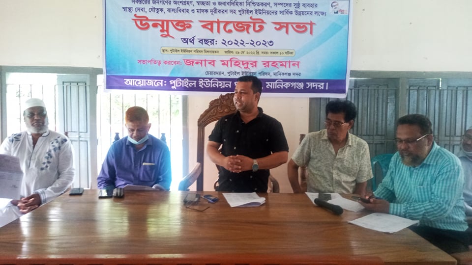 মানিকগঞ্জের পুটাইল ইউপির ২০২২-২০২৩ অর্থবছরের উন্মুক্ত বাজেট ঘোষনা অনুষ্ঠিত হয়েছে। গতকাল রোববার দুপুরে ইউনিয়ন পরিষদ মিলনায়তনে ইউপি সচিব মো: নজরুল ইসলাম খান ১ কোটি ৭২ লক্ষ ৯৪ হাজার ৮১৮ টাকার বাজেট ঘোষনা করেন। যা গত বছরের চেয়ে ৩৩ লক্ষ ৬৬ হাজার ৩৪ টাকা কম। তবে এবারে সর্বোচ্চ বাজেট রাখা হয়েছে যোগাযোগ খাতে, ৭২ লক্ষ ৪৮ হাজার টাকা। পুটাইল ইউপি চেয়ারম্যান মো: মহিদুর রহমানের সভাপতিত্বে উক্ত বাজেট ঘোষনা অনুষ্ঠানে বক্তব্য রাখেন,বাংলাদেশ আওয়াামীগ পুটাইল শাখার সভাপতি মনোয়ার হোসেন বিশ্বাস গিনি,জাতীয় পার্টি পুটাইল শাখার সভাপতি আব্দুস সামাদ, আবুল বাসার আব্বাসী সহ- সভাপতি বাংলাদেশ সাংবাদিক সমিতি মানিকগঞ্জ জেলা, উপ সহকারী কৃষিকর্মকর্তা মো: মোসারফ হোসেন, জামাল উদ্দীন মাস্টার সাধারন সম্পাদক আওয়ামীলীগ পুটাইল শাখা, দীনবন্ধু রায় প্রধান শিক্ষক লেমুবাড়ী উচ্চ বিদ্যালয়, মো: রফিজ উদ্দীন সমাজ সেবক প্রমুখ। উক্ত বাজেটে সন্তোষ্ট প্রকাশ করে বক্তারা বলেন, প্রকাশিত বাজেটটি যেন লোক দেখানো এবং শুধু কাগজ করমে না হয়ে সঠিকভাবে বাস্তবায়ন হয়। আর সঠিক ভাবে বাস্তবায়ন হলেই পুটাইল ইউনিয়ন হবে উঠবে উন্নয়নের একটি রুলমডেল। পরিশেষে সমাপনি বক্তব্য রাখেন ইউপি চেয়ারম্যান ও বাজেট ঘোষনা অনুষ্ঠানের সভাপতি মহিদুর রহমান মহিদ।